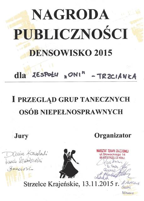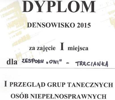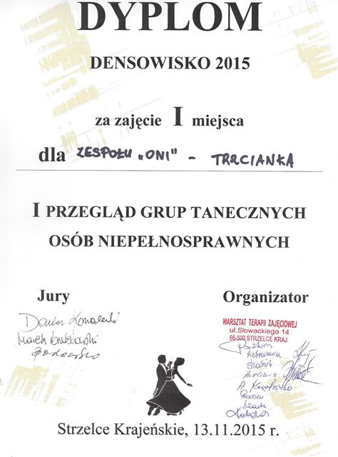 W piątek 13.11.2015 mieliśmy przyjemność uczestniczyć w imprezie pt. "Densowisko" organizowanej przez WTZ Strzelce Krajeńskie. Odbyliśmy tam zajęcia z choreoterapii oraz braliśmy udział w I Przeglądzie Grup Tanecznych Osób Niepełnosprawnych. Grupa teatralna "ONI" zajęła I miejsce oraz porwała serca widzów i otrzymała nagrodę publiczności! Bardzo dziękujemy za możliwość uczestniczenia w imprezie!