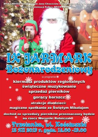Zapraszamy serdecznie na IX Jarmark Bożonarodzeniowy, który w tym roku rozpocznie się od godz.14.00, tradycyjni na placu Kościuszki. W programie nie zabraknie również licznych atrakcji. Dochód ze sprzedaży pierników przeznaczony będzie na rzecz Weroniki Rolniczak. Zapraszamy serdecznie 🎅🌲⛄❄💥🌟💫✨