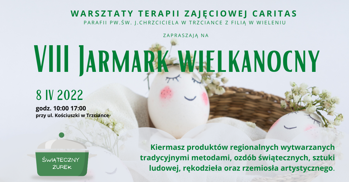Warsztaty Terapii Zajęciowej Caritas z Filią w Wieleniu oraz Parafia pw. św. Jana Chrzciciela zapraszają serdecznie na VIII Jarmark Wielkanocny. W programie: – kiermasz produktów regionalnych wytwarzanych tradycyjnymi metodami, ozdób świątecznych sztuki ludowej, rękodzieła oraz rzemiosła artystycznego – świąteczny żurek